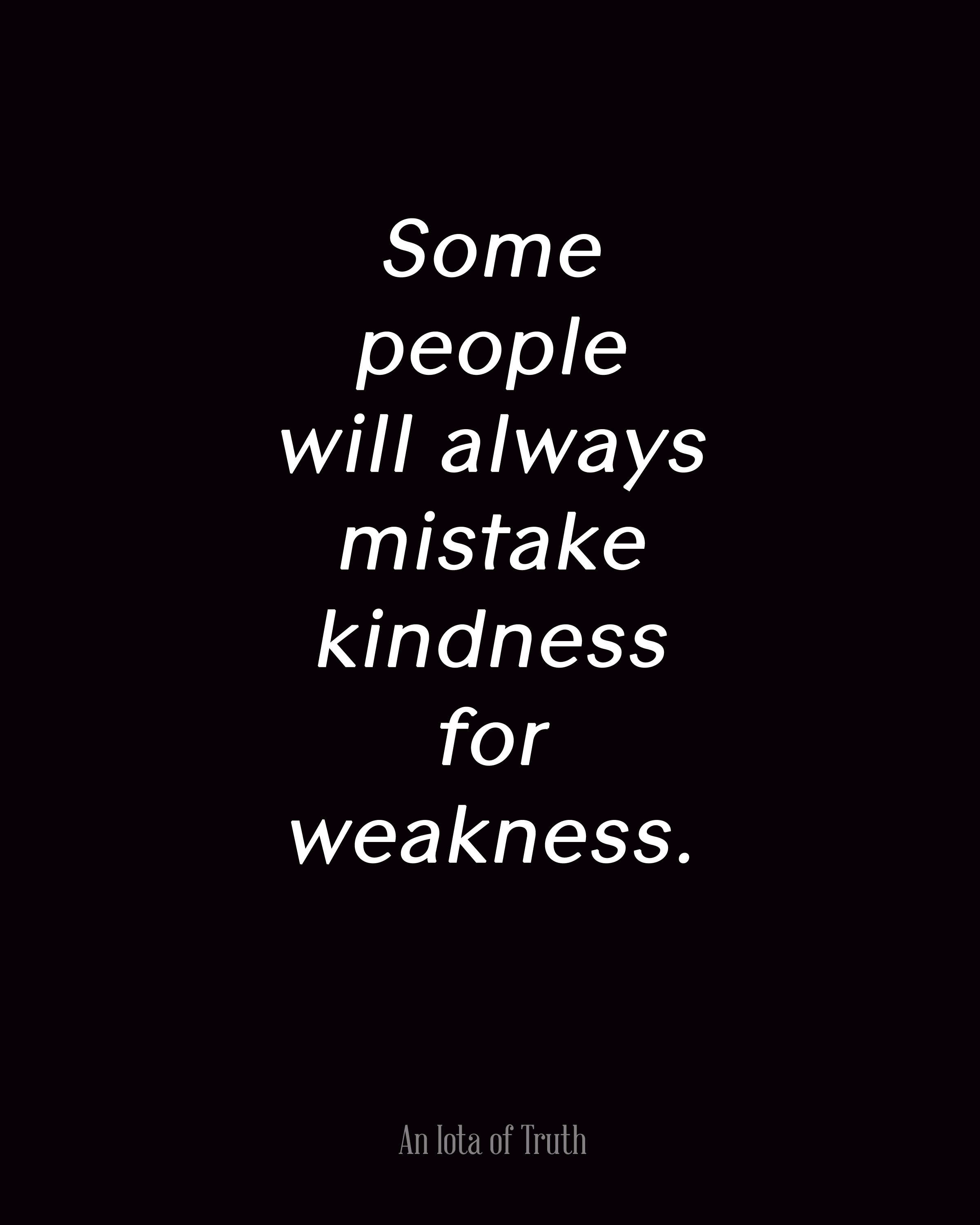 With all the toys in the world people choose feelings to play with Tyga 2. I am kind to everyone but when someone is unkind to me weak is not what you are going to remember about me Al. Dont Take My Kindness for Weakness Quotes 1Compassion and tolerance are not a sign of weakness but a sign of strength Dalai Lama 2If someone mistakes your kindness for.